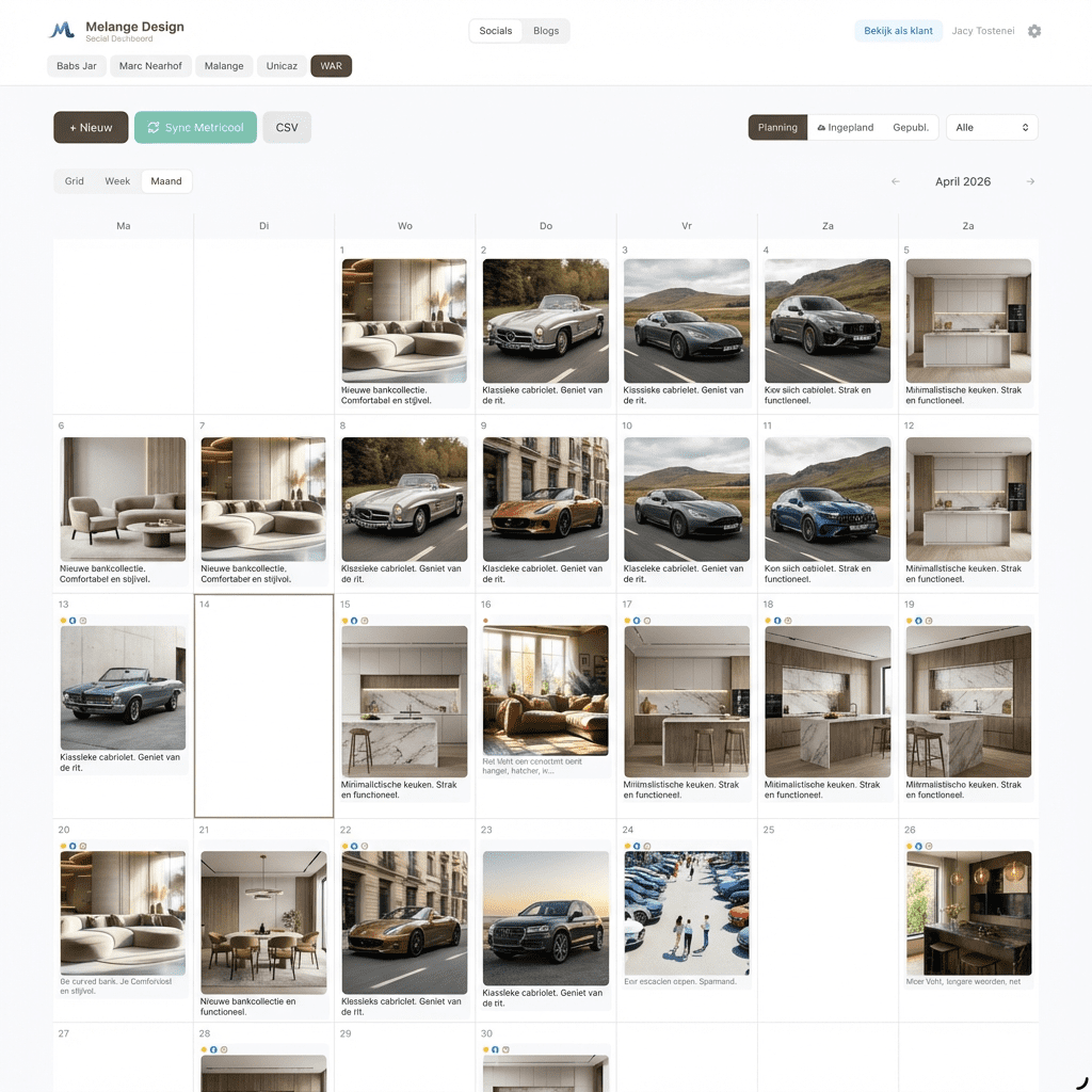 Social media beheer klinkt simpel: een bericht schrijven, een foto erbij, inplannen en klaar. Maar als je voor meerdere klanten werkt, elk met hun eigen tone of voice, hun eigen goedkeuringsproces en hun eigen verwachtingen, dan schiet een standaard tool al snel tekort. Daarom hebben we ons eigen Social Media en Blog Dashboard ontwikkeld: een centraal systeem waarin alles samenkomt.