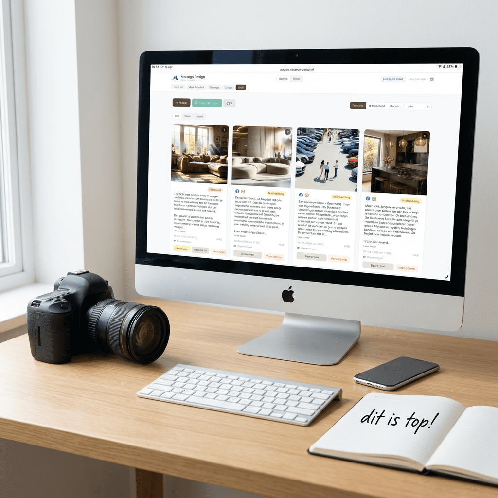 Ons dashboard brengt het volledige social media proces samen in een overzichtelijke interface. Per klant zie je alle berichten in een grid-, week- of maandweergave. Elk bericht heeft een duidelijke status: in afwachting, goedgekeurd, ingepland of gepubliceerd. De klant logt in op een eigen omgeving en ziet precies welke berichten klaarstaan ter goedkeuring.